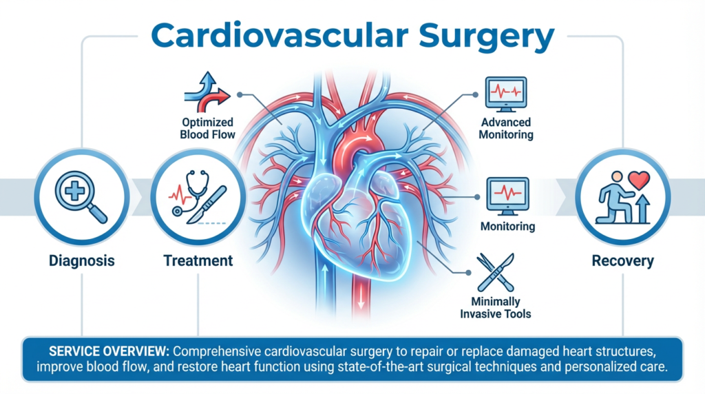 Cardiovascular surgery is a specialized branch of surgery that treats diseases of the heart, arteries, and veins. It includes procedures to restore blood flow, repair structural heart problems, replace damaged valves, and treat diseases of major blood vessels such as the aorta. These conditions often develop due to aging, lifestyle factors, genetic predisposition, or long-standing medical conditions such as diabetes and hypertension.